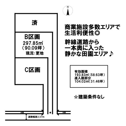 | 備考 | ●造成、地目変更後の引き渡し ●南側接道は43条但し書き道路のため、建築物は準防火地域の規定に要適合 ●B区画 297.85㎡(90.09坪)※有効面積193.83㎡(58.63坪)975万円 ●C区画 254.91㎡(58.52坪)※有効面積193.48㎡(58.52坪)975万円 |