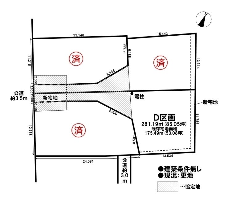 | 備考 | ●建築条件無しの為、お好みのハウスメーカーさんで建築可能です。 ●D区画:敷地面積281.19㎡(既存宅地・面積175.49㎡) ●協定地部分はアスファルト舗装(上水道引込は売主にて対応) |