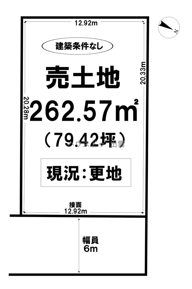 | 土地面積 | 実262.57㎡(79.42坪) | 接道 | 東側(私道)幅 約6.0m 間口 約12.92m(位置指定) |