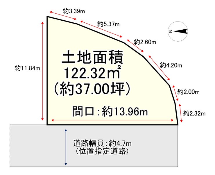 | 土地面積 | 公122.32㎡(37坪) | 接道 | 西側幅 約4.7m 間口 約13.96m |