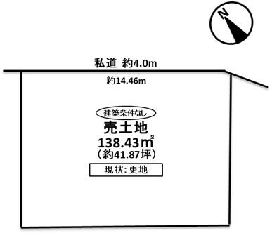 | 土地面積 | 公138.43㎡(41.87坪) | 接道 | 北側(私道)幅 約4.0m 間口 約14.46m |
