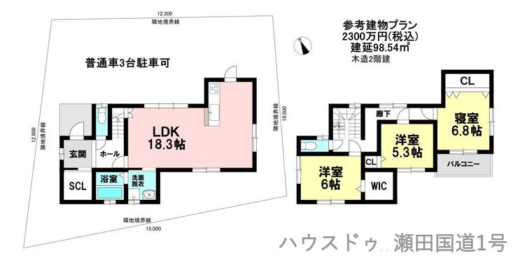 | 土地面積 | 公154.84㎡(46.83坪) | 接道 | 北側(私道)幅 約3.8m 間口 約12.00m 南側(私道)幅 約5.0m 間口 約15.00m |