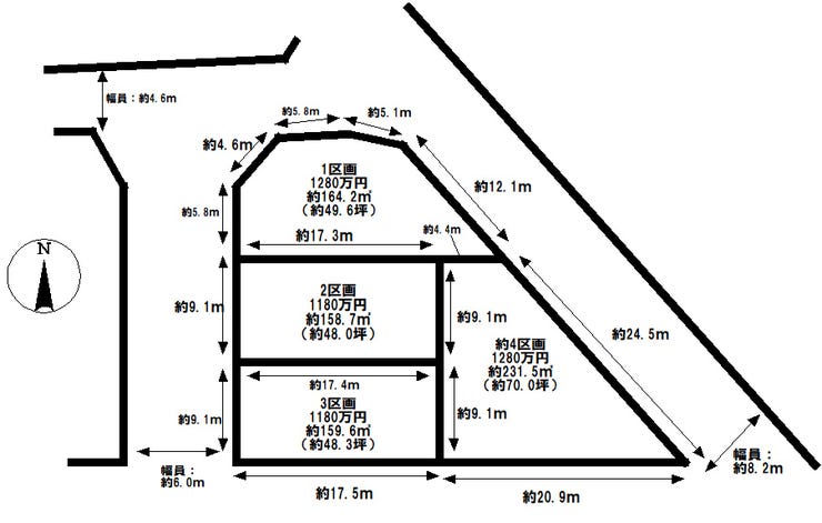 | 備考 | ■上水道・下水道・都市ガス宅地内引込無し(2区画:上水道既存引込有) ※ライフラインの引込費用は買主様負担となります ※分筆前につき、地積に差異が生じる場合があります ■1区画~3区画私道持分:各持分1/3 |