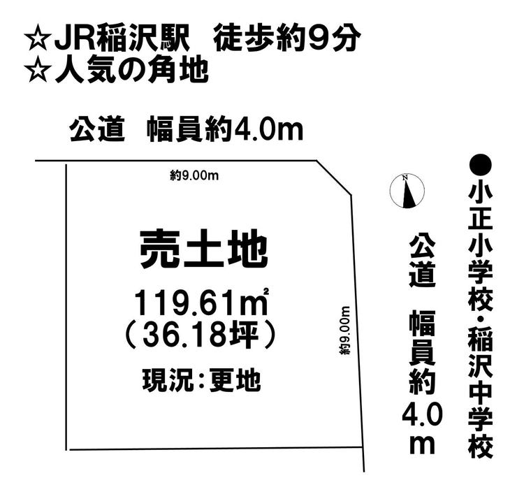 | 土地面積 | 119.61㎡(36.18坪) | 接道 | 北側(公道)幅 約4.0m 間口 約9.00m 東側(公道)幅 約4.0m 間口 約9.00m |