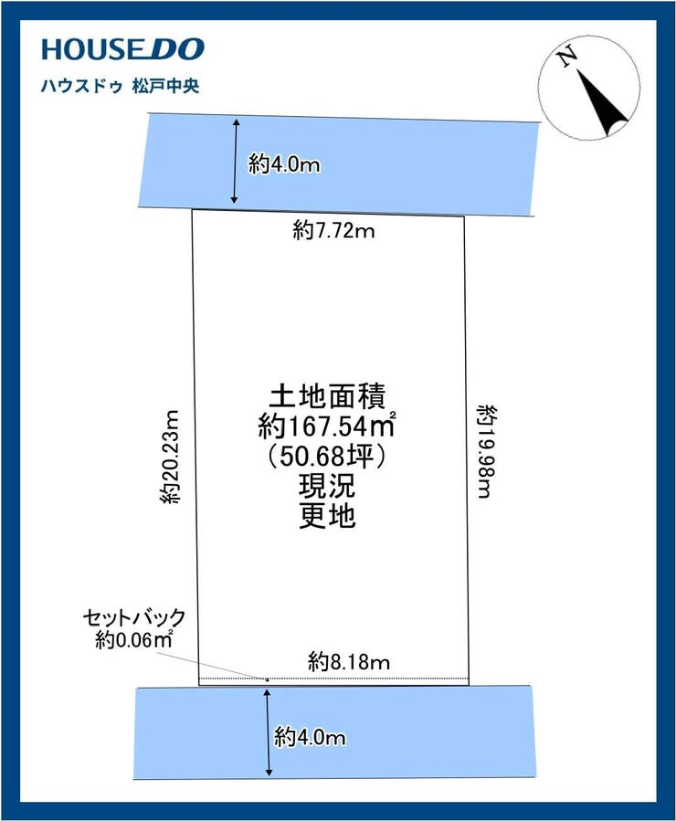 | 土地面積 | 公167.54㎡(50.68坪) | 接道 | 北側(公道)幅 約4.0m 南側(公道)幅 約4.0m |