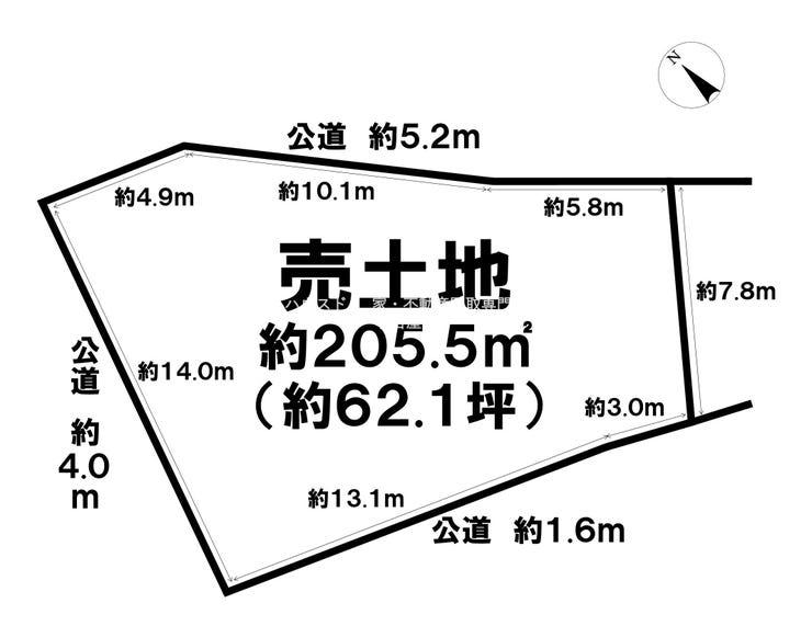 | 土地面積 | 公205.51㎡(62.16坪) | 接道 | 北側(公道)幅 約5.2m 間口 約21.90m 西側(公道)幅 約4.0m 間口 約14.00m 南東側(公道)幅 約1.6m 間口 約16.10m |