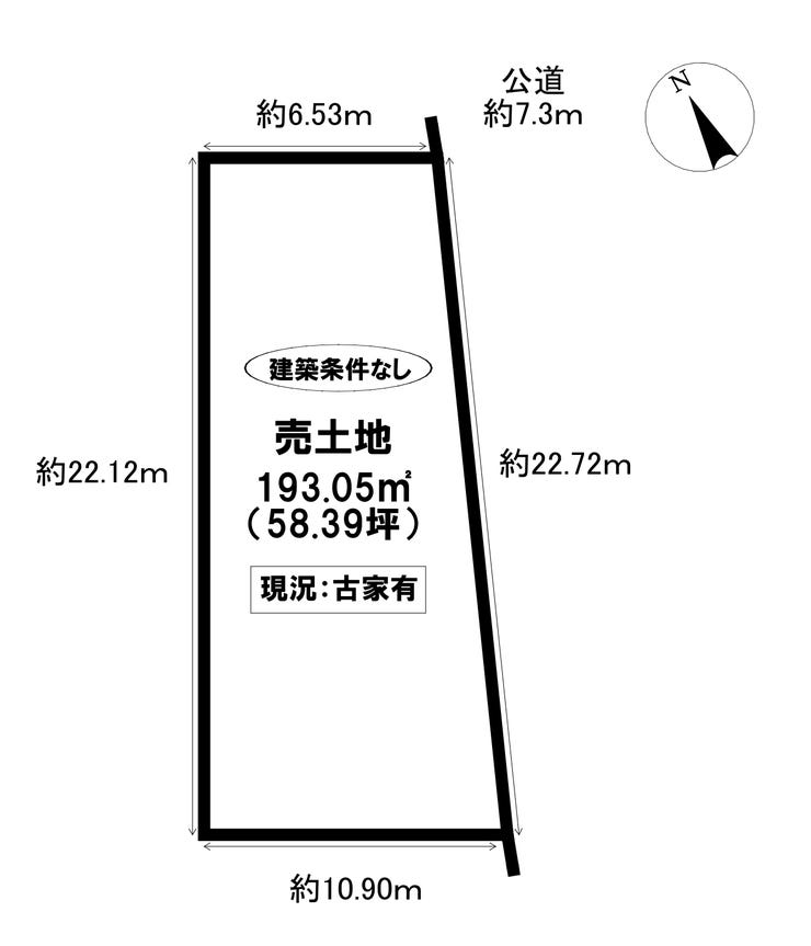 | 土地面積 | 公193.05㎡(58.39坪) | 接道 | 東側(公道)幅 約7.3m 間口 約22.72m |