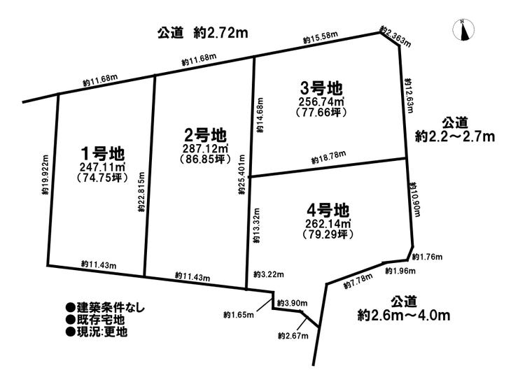 | 土地面積 | 公247.11㎡(74.75坪) | 接道 | 北側(公道)幅 約2.7m 間口 約11.68m |