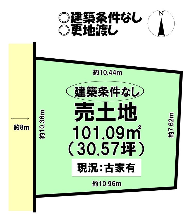| 土地面積 | 公101.09㎡(30.57坪) | 接道 | 西側(公道)幅 約8.0m 間口 約10.36m |