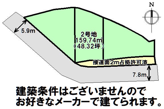 | 土地面積 | 159.74㎡(48.32坪) | 接道 | 南西側(公道)幅 約5.9m 南側(公道)幅 約7.8m |