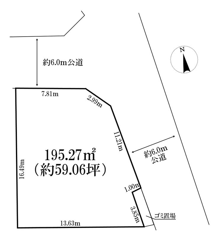 | 土地面積 | 実195.27㎡(59.06坪) | 接道 | 北側(公道)幅 約6.0m 東側(公道)幅 約6.0m |