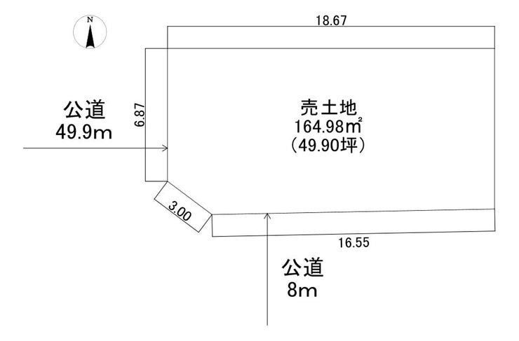 | 土地面積 | 実164.98㎡(49.90坪) | 接道 | 南側(公道)幅 約8.0m 間口 約16.55m 西側(公道)幅 約49.9m 間口 約6.87m |