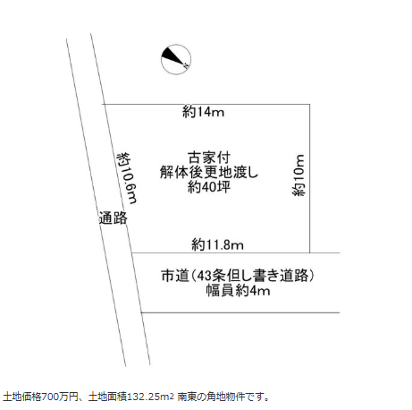 土地価格700万円、土地面積132.25㎡南東の角地物件です。