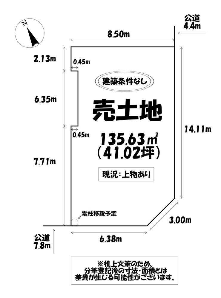 | 土地面積 | 実135.63㎡(41.02坪) | 接道 | 南西側(公道)幅 約7.9m 南東側(公道)幅 約4.4m |