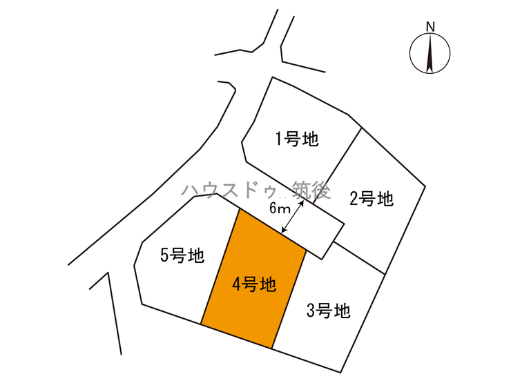 4号地は、分譲地の中でも特に形がきれいな整形地で、建築プランが立てやすい区画です。前面道路は幅員6mの開発道路で、車の出入りもしやすく、分譲地内道路のため通行量も少ない落ち着いた環境です。