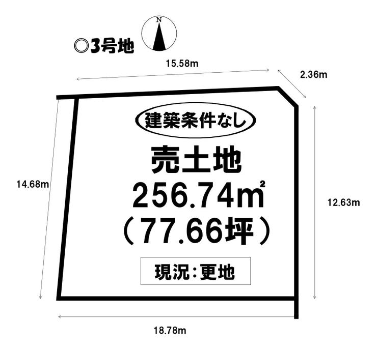 | 土地面積 | 256.74㎡(77.66坪) | 接道 | 北側(公道)幅 約2.7m 間口 約15.58m 東側(公道)幅 約2.7m 間口 約12.63m |