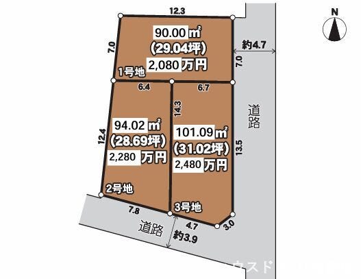 | 分譲情報 | 【販売区画】:3区画 【価格】:2,080万円 ~2,480万円 【土地面積】:90.00㎡ ~101.90㎡ |