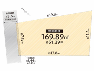 | 土地面積 | 実169.89㎡(51.39坪) | 接道 | 北西側(公道)幅 約3.6m 間口 約7.65m |