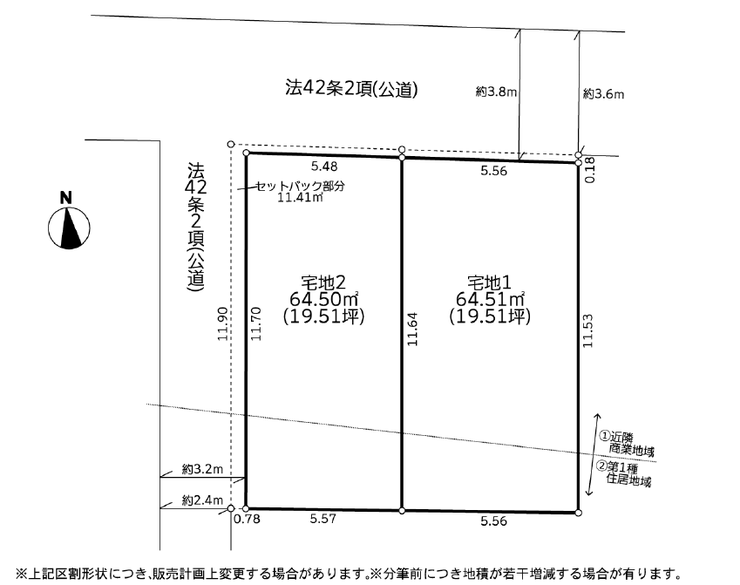 | 土地面積 | 公64.51㎡(19.51坪) | 接道 | 北側(公道)幅 約3.8m 間口 約5.56m |