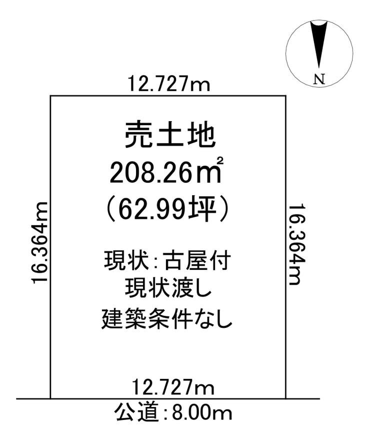 | 土地面積 | 公208.26㎡(62.99坪) | 接道 | 北側(公道)幅 約8.0m 間口 約12.72m |