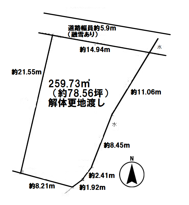 | 土地面積 | 公259.73㎡(78.56坪) | 接道 | 北側(公道)幅 約5.9m 間口 約14.94m |