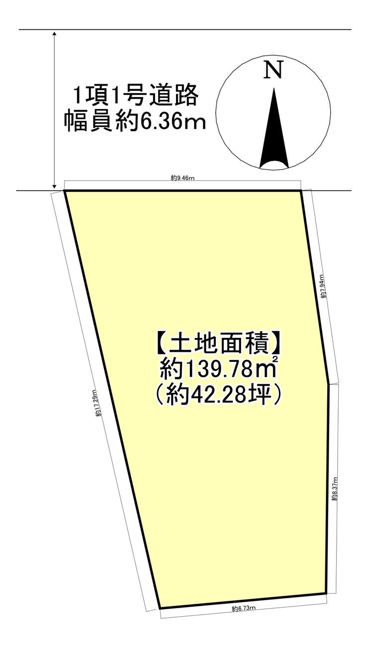 | 土地面積 | 実139.78㎡(42.28坪) | 接道 | 北側(公道)幅 約6.3m 間口 約9.46m |