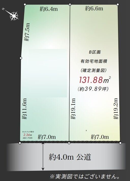 | 土地面積 | 実131.88㎡(39.89坪) | 接道 | 南西側(公道)幅 約4.0m 間口 約7.00m |