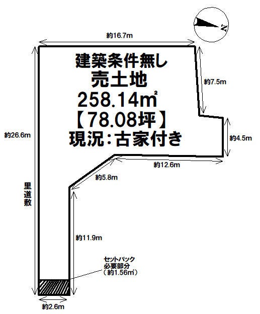 | 土地面積 | 公258.14㎡(78.08坪) | 接道 | 東側(公道)幅 約3.6m 間口 約2.60m |