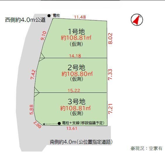 | 土地面積 | 公108.81㎡(32.91坪) | 接道 | 西側(公道)幅 約4.0m 間口 約5.88m 南側(私道)幅 約4.0m 間口 約13.61m |