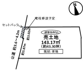 | 備考 | ☆建築条件無し ☆造成後のお引渡し ☆敷地:43.3坪 ■上下水道の引込管は無し(引込工事には別途費用要) ■西側道路上の電柱を敷地内北西角に移設予定 ※西側道路幅員の一部は道路幅員4m未満の為、セットバックが必要となります。セットバックにあたり、狭あい道路に関する事前協議が必要となります。また、西側道路は里道となります。 ※敷地内西側道路沿いの一部に地中埋設管があります。現況のままで引き渡しになります。埋設管については、契約不適合責任免責となります。 |