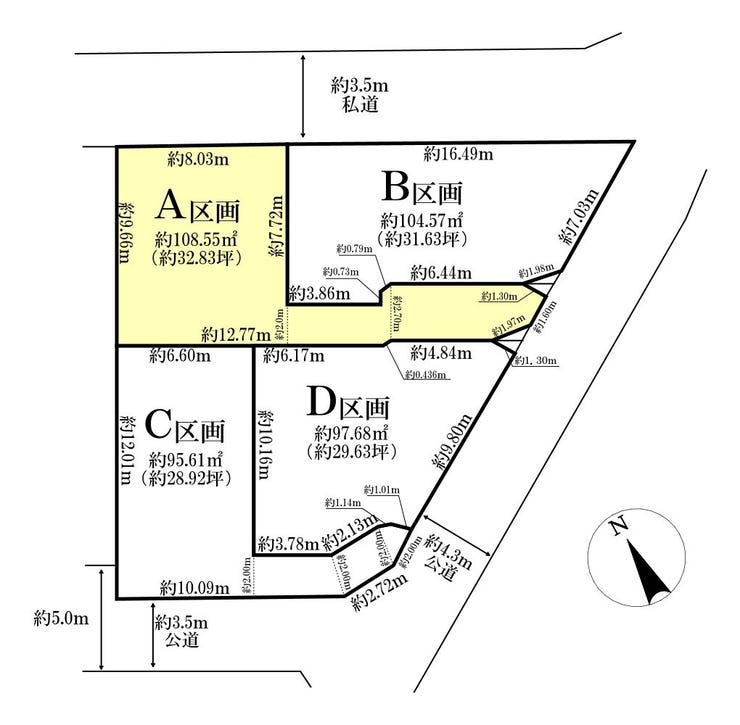 | 土地面積 | 実108.55㎡(32.83坪) | 接道 | 北東側(私道)幅 約3.5m |