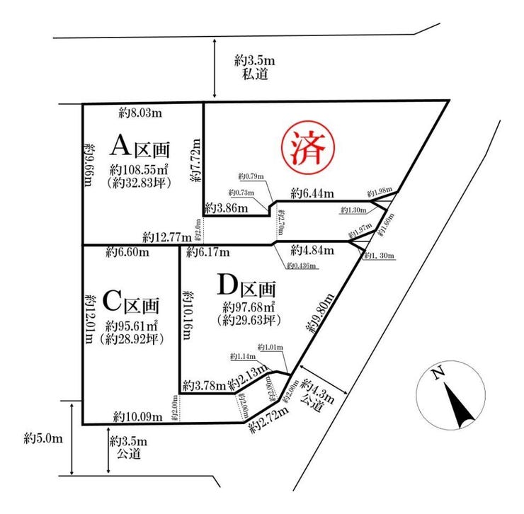 | 土地面積 | 実95.61㎡(28.92坪) | 接道 | 南西側(公道)幅 約3.5m 南側(公道)幅 約4.3m |