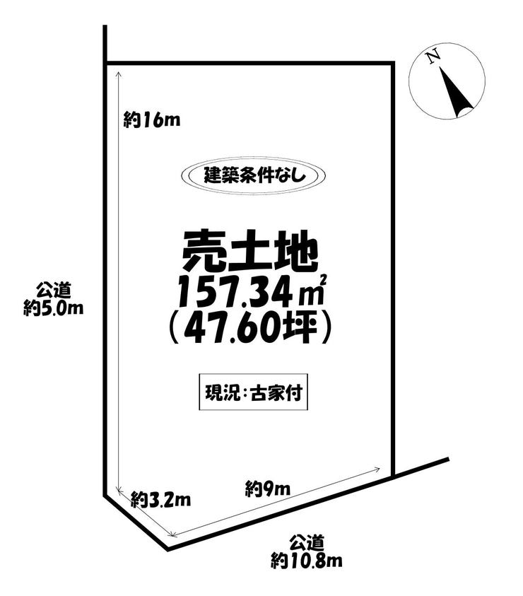 | 土地面積 | 157.34㎡(47.59坪) | 接道 | 南側(公道)幅 約10.8m 間口 約9.00m 西側(公道)幅 約5.0m 間口 約16.00m |