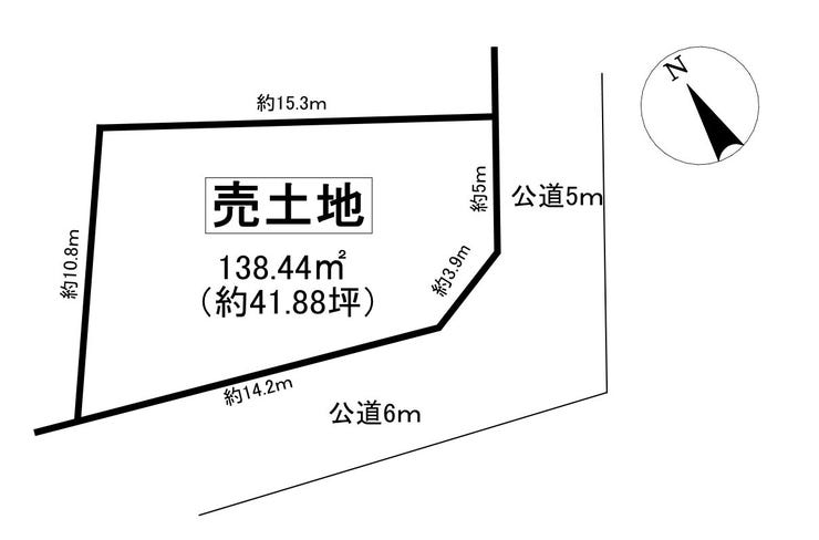 | 土地面積 | 公138.44㎡(41.87坪) | 接道 | 東側(公道)幅 約5.0m 間口 約8.90m 南側(公道)幅 約6.0m 間口 約14.20m |