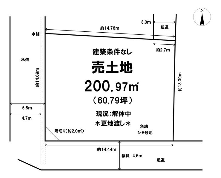 | 土地面積 | 200.97㎡(60.79坪) | 接道 | 南側(私道)幅 約4.6m 間口 約14.40m 北側(私道)幅 約3.0m 間口 約2.70m 西側(私道)幅 約5.5m 間口 約14.60m |