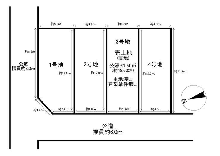 | 土地面積 | 61.5㎡(18.60坪) | 接道 | 北西側(公道)幅 約6.0m 間口 約4.80m |