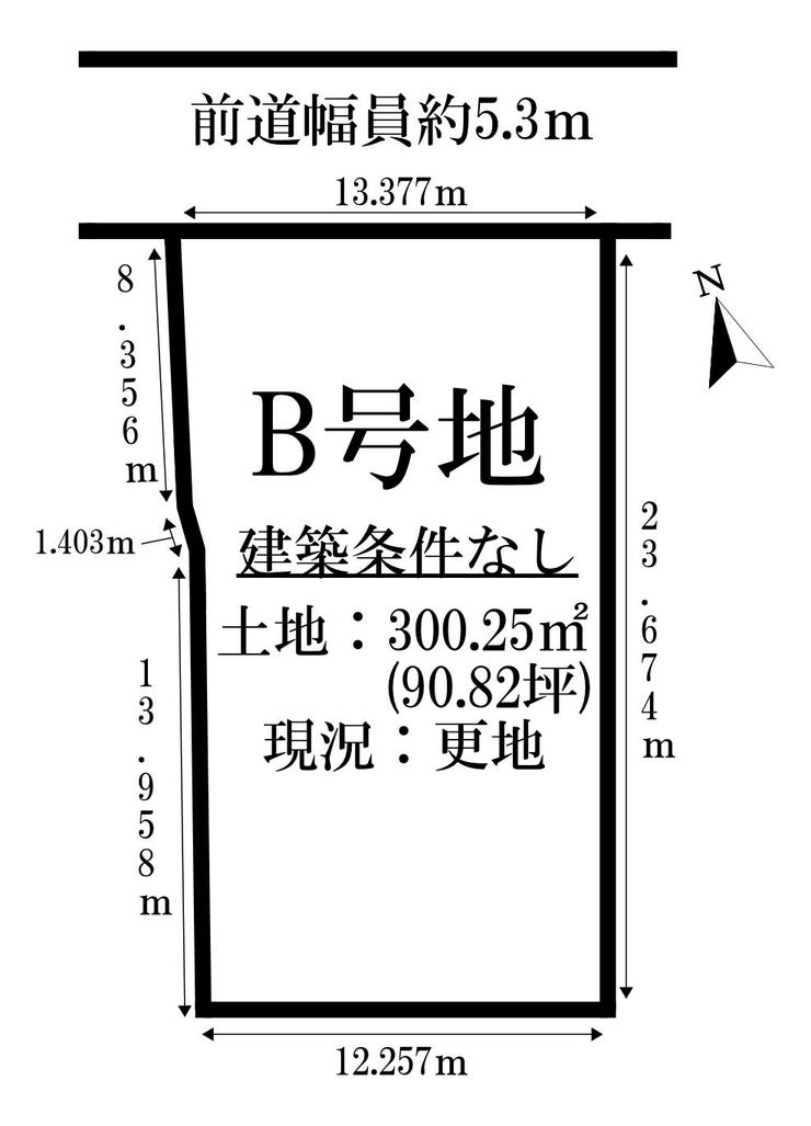 | 土地面積 | 実300.25㎡(90.82坪) | 接道 | 北側(公道)幅 約5.3m 間口 約13.37m |