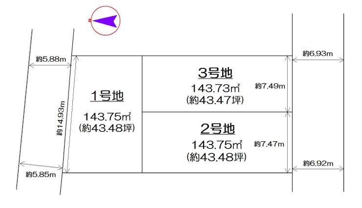| 土地面積 | 公143.75㎡(43.48坪) | 接道 | 北側幅 約5.8m 間口 約14.93m |