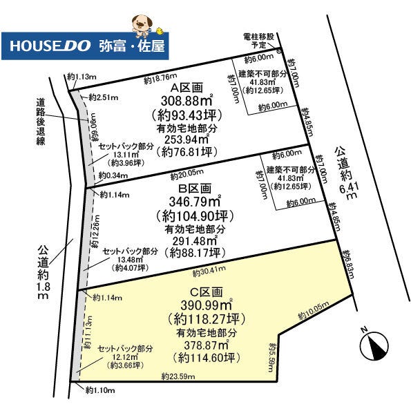 | 土地面積 | 公390.99㎡(118.27坪) | 接道 | 東側(公道)幅 約6.4m 間口 約6.83m 西側(公道)幅 約1.8m 間口 約11.13m |