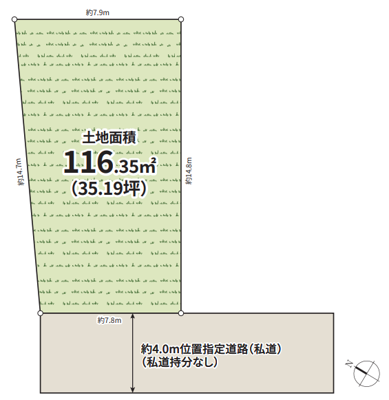 | 土地面積 | 116.35㎡(35.19坪) | 接道 | 南西側(私道)幅 約4.0m |