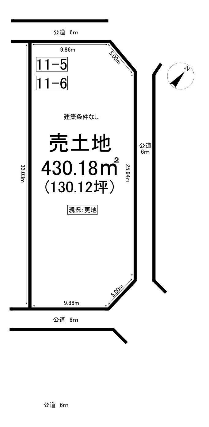 | 土地面積 | 公430.18㎡(130.12坪) | 接道 | 南東側(公道)幅 約6.0m 間口 約9.88m 北西側(公道)幅 約6.0m 間口 約9.86m 北東側(公道)幅 約6.0m 間口 約25.94m |