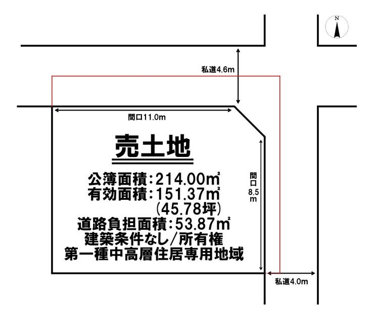 | 土地面積 | 公214㎡(64.73坪) | 接道 | 北側(私道)幅 約4.6m 間口 約11.00m 東側(私道)幅 約4.0m 間口 約8.50m |