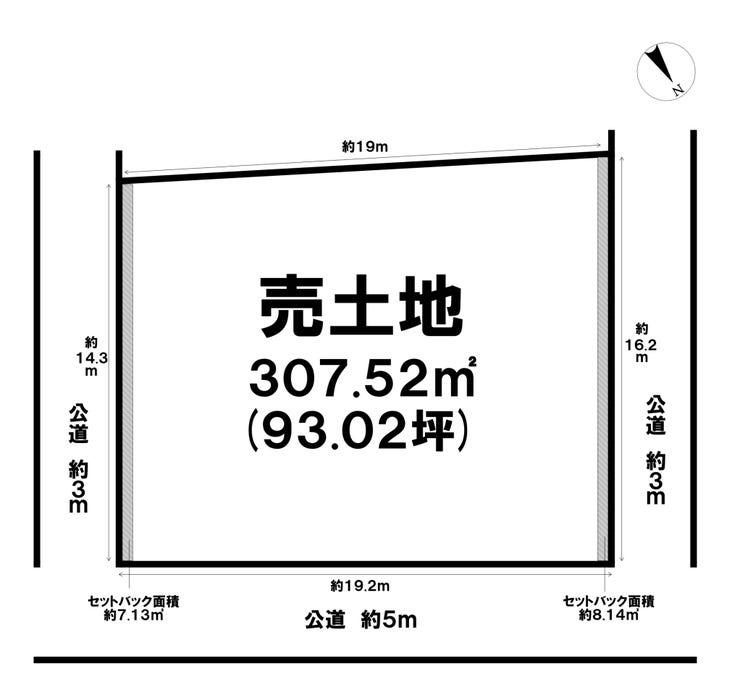 | 土地面積 | 307.52㎡(93.02坪) | 接道 | 南東側(公道)幅 約3.0m 間口 約14.32m 北東側(公道)幅 約5.0m 間口 約19.25m 北西側(公道)幅 約3.0m 間口 約16.26m |
