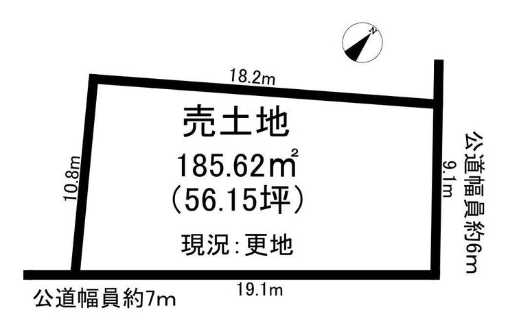 | 土地面積 | 185.62㎡(56.15坪) | 接道 | 北東側(公道)幅 約6.0m 間口 約9.10m 南東側(公道)幅 約7.4m 間口 約19.10m |