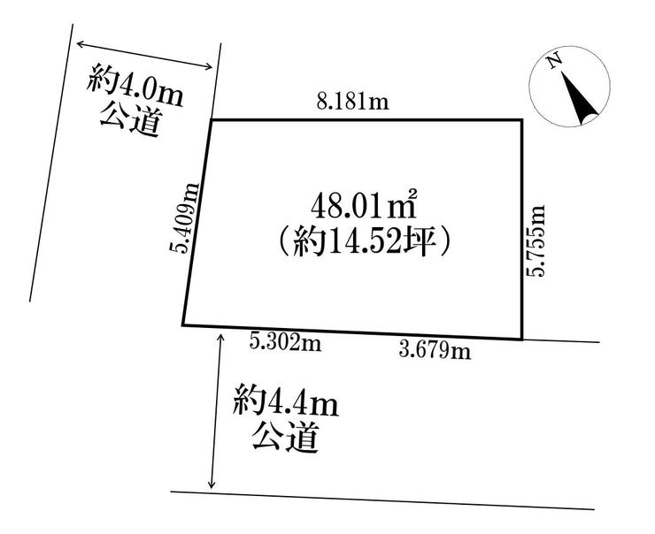 | 土地面積 | 実48.01㎡(14.52坪) | 接道 | 南西側(公道)幅 約4.4m 北西側(公道)幅 約4.0m |