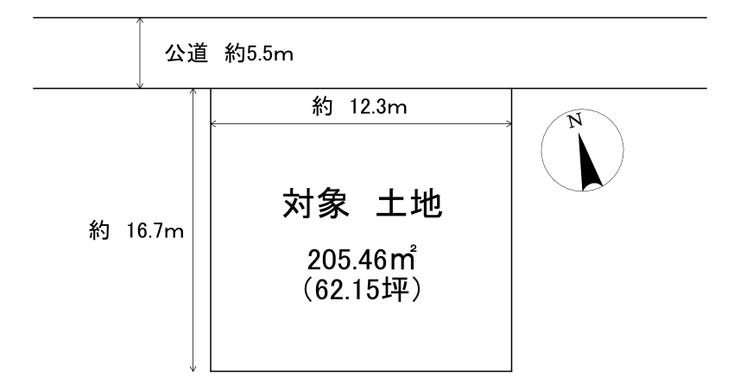 | 土地面積 | 公205.46㎡(62.15坪) | 接道 | 北側(公道)幅 約5.5m 間口 約12.30m |