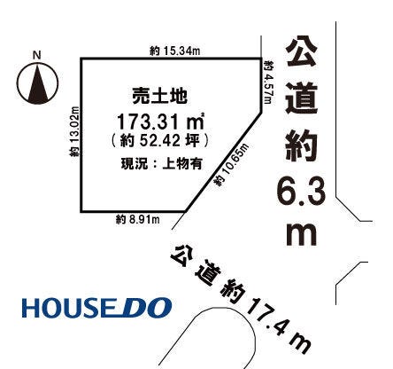 | 土地面積 | 公173.31㎡(52.42坪) | 接道 | 東側(公道)幅 約6.3m 間口 約4.57m 南東側(公道)幅 約17.4m 間口 約10.65m |