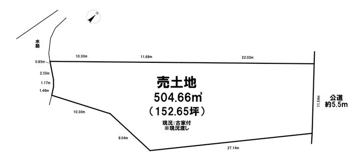 | 土地面積 | 実504.66㎡(152.65坪) | 接道 | 北東側(公道)幅 約5.5m 間口 約11.54m |