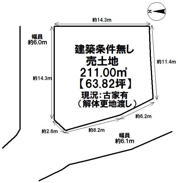 | 土地面積 | 公211㎡(63.82坪) | 接道 | 北側(公道)幅 約6.0m 間口 約16.92m 南西側(公道)幅 約6.1m 間口 約14.45m |