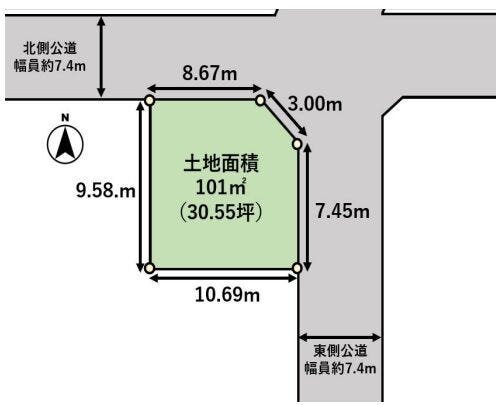 | 土地面積 | 公101㎡(30.55坪) | 接道 | 北側(公道)幅 約7.4m 東側(公道)幅 約7.4m |
